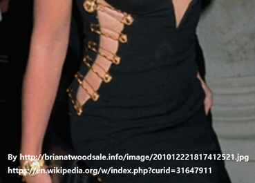 1994년, 배우 엘리자베스 헐리(Elizabeth Hurley)는 런던에서 열린 영화 <네 번의 결혼식과 한 번의 장례식> 시사회에서, 베르사체가 디자인한 ‘안전핀 드레스’를 입고 등장했다. 이 드레스는 패션계에서 큰 반향을 일으켰으며, 단순한 고정도구였던 안전핀이 패션의 아이콘으로 자리 잡는 계기가 되었다.