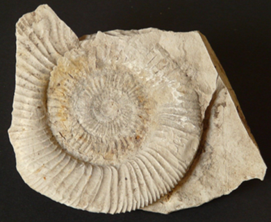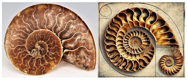 길이 방향으로 자른 암모나이트의 종단면은 지구상의 퇴적암 속에서 다양한 형태로 발견되는 멸종된 이 나선형 껍질이 달팽이와 그닥 관련 없음을 잘 드러내 보인다.