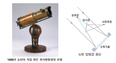 기능적 관점에서 본다면 현대적 천체 망원경의 기본 설계에 대한 공적은 ‘아이작 뉴턴’에게로 돌아간다. 뉴턴은 1668년에 최초로 완전히 제 기능을 발휘하는 가장 일반적인 형태의 반사 망원경을 발명했다. 그가 설계한 반사경에는 투과된 빛을 모아 초점으로 반사시키기 위해 내부에 오목 거울이 배치되었다. 초점으로 반사된 빛은 반사경에 의해 다시 굴절되어 접안렌즈를 통해 관찰자의 시선에 도달한다.
