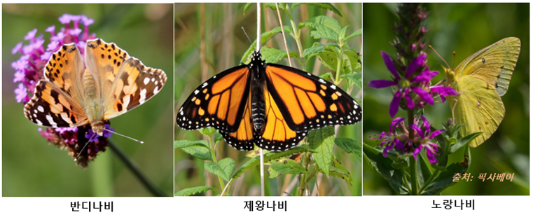 또 다른 예로, 노랑나비(Cloudless sulphur, Phoebis sennae)는 북미 남부와 중남미를 오가며 계절 변화에 따라 남북 방향의 반복적인 이동을 보인다. 특정 월동지에 집중되지는 않지만, 기온과 먹이식물의 변화에 반응해 방향성이 뚜렷한 이동을 수행한다는 점에서 명확한 이주성 나비로 분류된다.