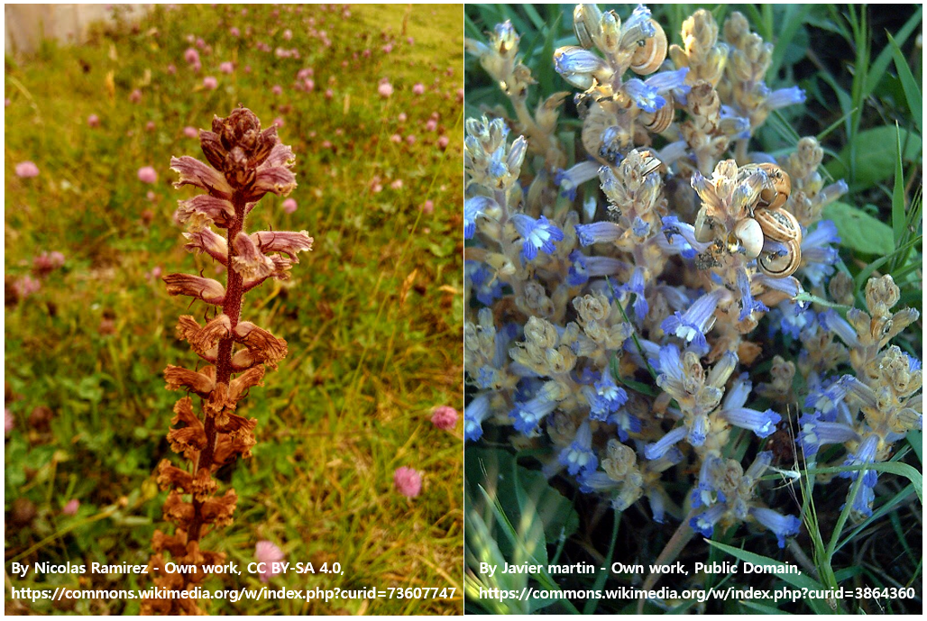 오러밴취 마이너(사진 왼쪽: Orobanche minor)는 토끼풀을, 오러밴취 러모사(사진 오른쪽: Orobanche ramosa)는 삼과 토마토 같은 작물에 기생하며, 숙주 식물을 말려 죽게 만들기도 한다.