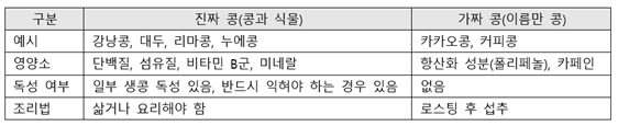진짜 콩과 가짜 콩을 구별하는 가장 쉬운 방법은 식물학적으로 콩과에 속하는지 확인하는 것이다. 아래 표를 보면 진짜 콩과 가짜 콩의 차이를 한눈에 확인할 수 있다.